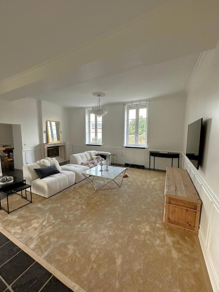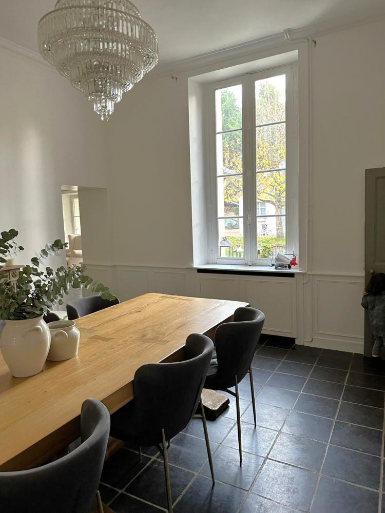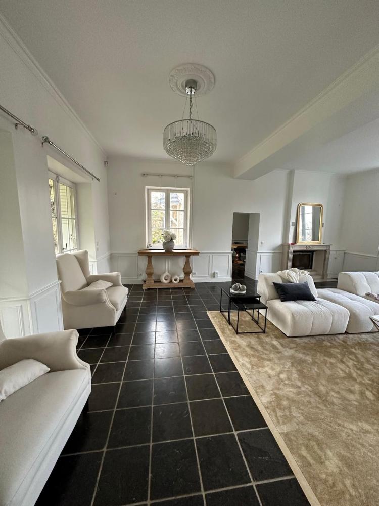 La maison principale de 253 m2 habitables (307m2 au total) se compose au rez-de-chaussée, carrelé en pierre d'hainaut, avec une hauteur sous plafond d'environ 3.50 m : d'une vaste entrée, un WC indépendant, une cuisine dinatoire, une salle-à-manger avec cheminée à insert traversant ouvrant sur un séjour pour offrir un espace de réception de 62m2.