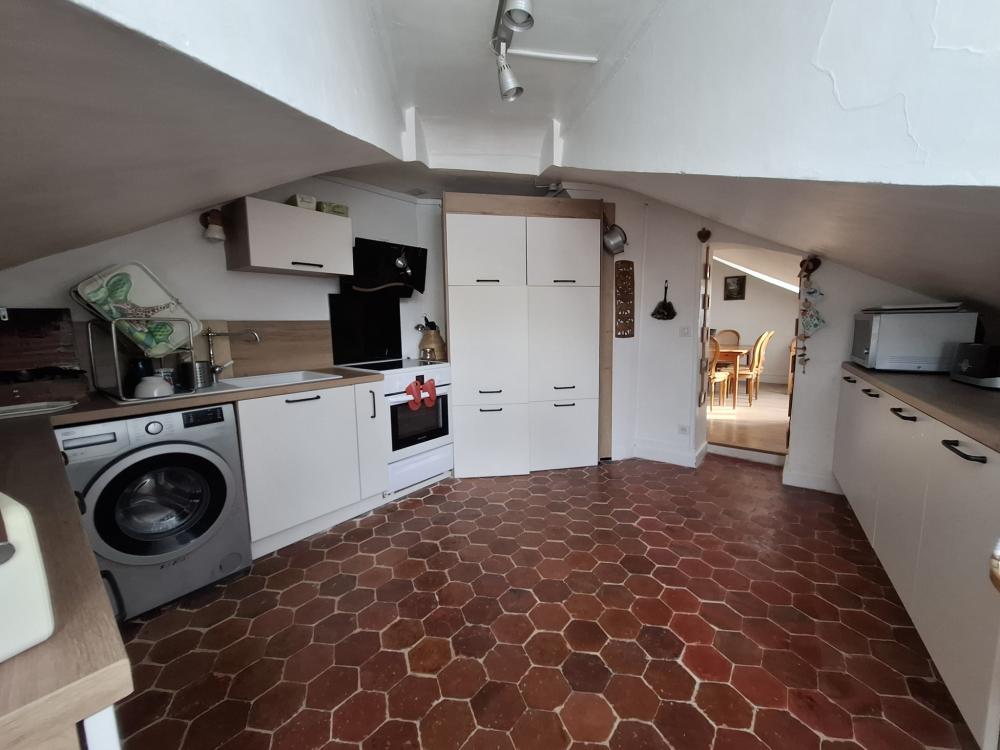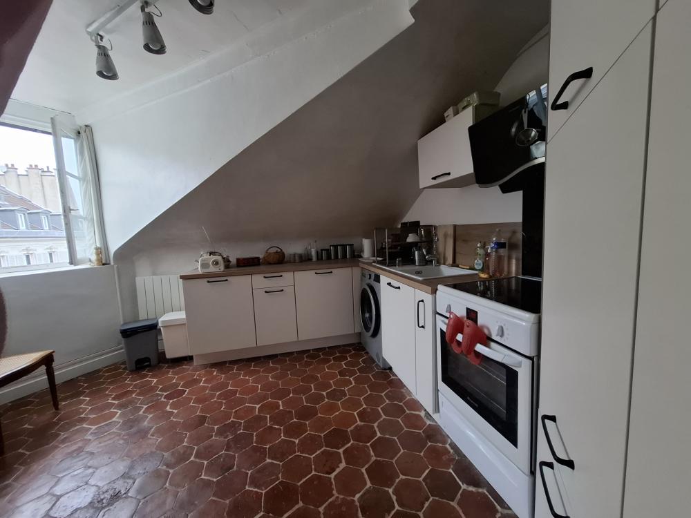 La cuisine, séparée, spacieuse et fonctionnelle, est un autre point fort de l’appartement. Revêtue de tomettes anciennes, elle offre une atmosphère authentique et une jolie vue dégagée sur les toits de Versailles
